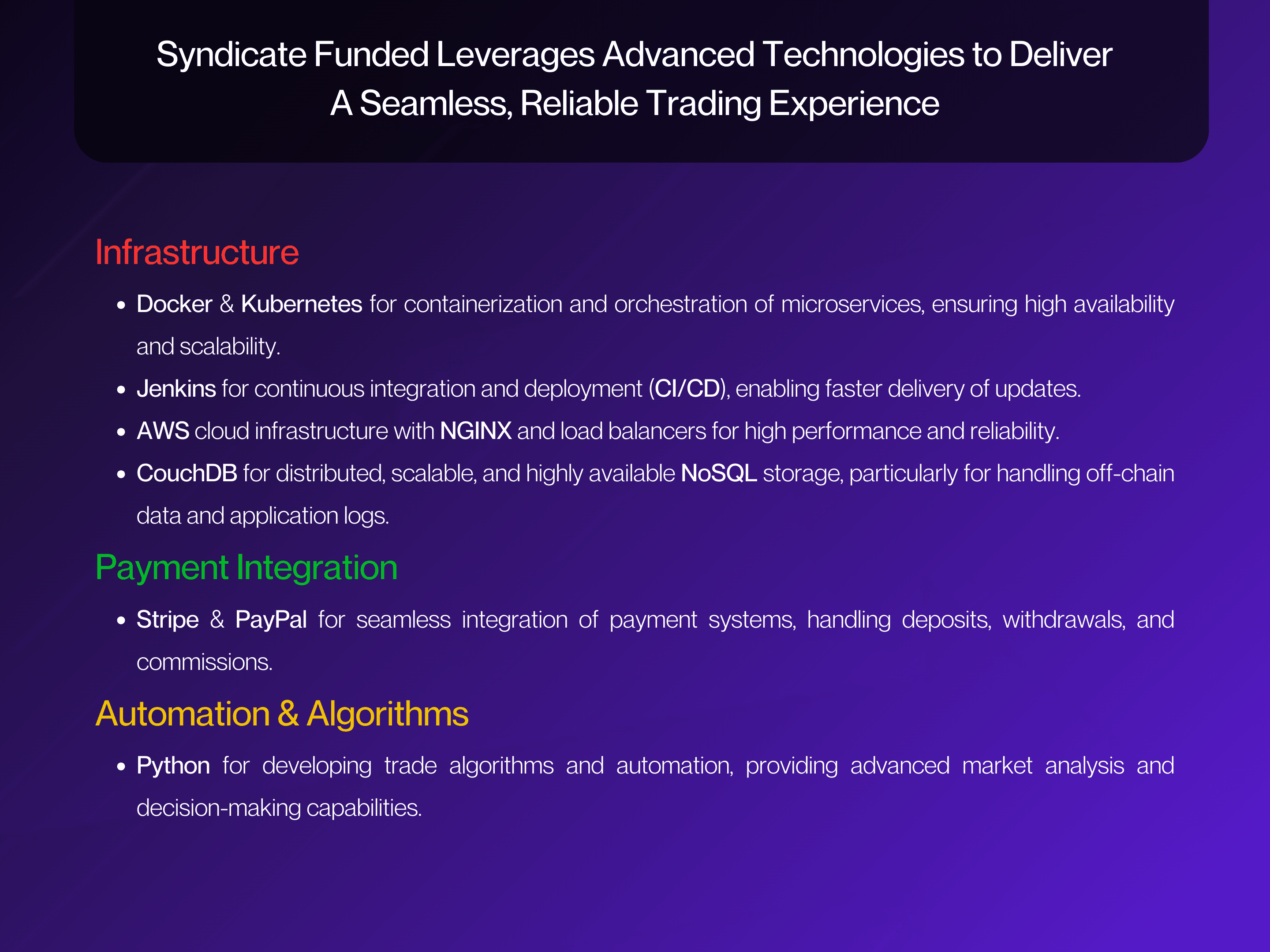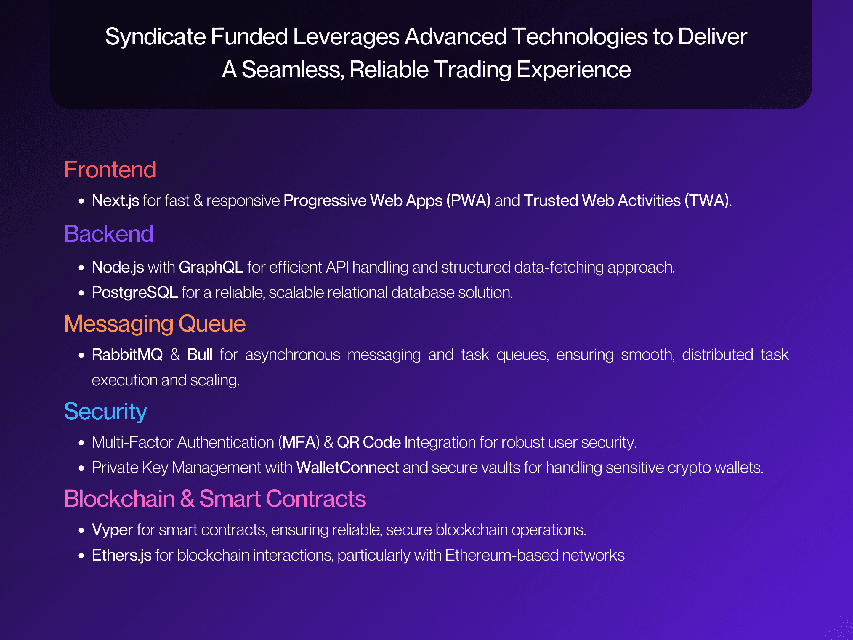 As a full-scale funded trading platform, Syndicate Funded had to support complex multi-phase evaluations, real-time account analytics, and high-volume trading operations without performance degradation. The system required secure payment orchestration through Stripe and PayPal, instant approvals, profit-splitting logic, and automated commission handling for affiliates. It also demanded a responsive interface across web and mobile, blockchain-based smart contracts for secure vault operations, MFA and QR-based authentication, and a microservices infrastructure capable of scaling under continuous data flow. These requirements needed to be delivered with institutional-grade reliability, accuracy, and user trust at the core.